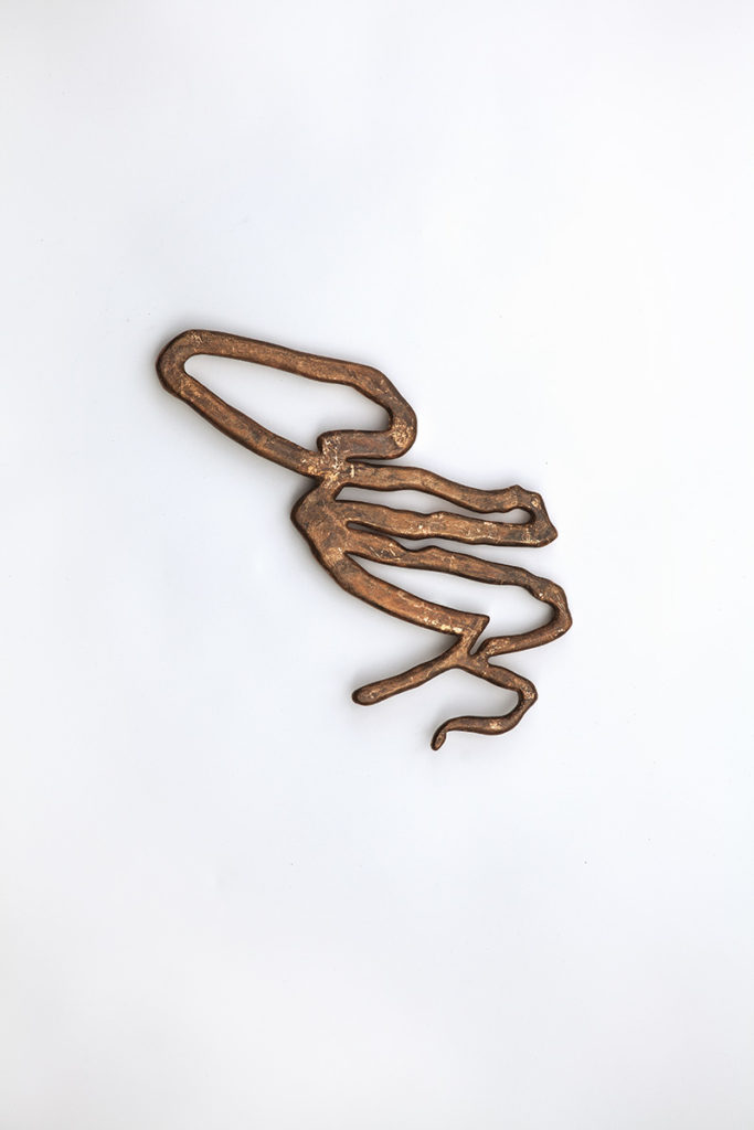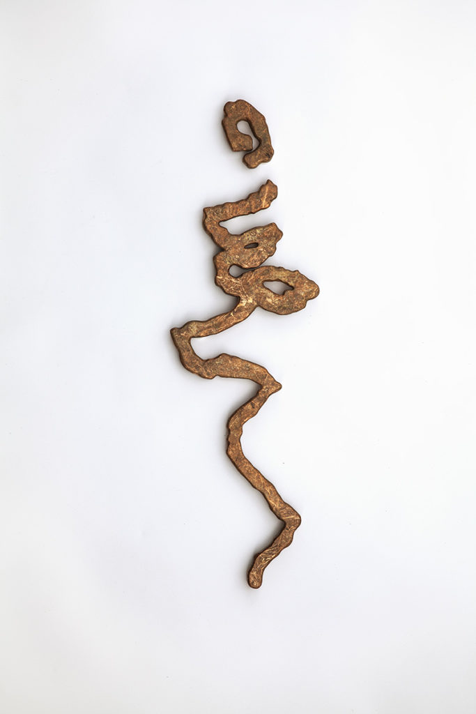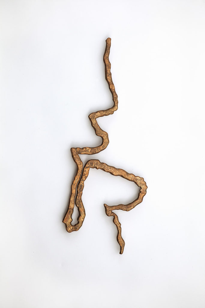 After I made a number of the Glyph document pieces based on the bark beetle outlines, I conceived the idea of the Glyphs as larger metallic objects. I imagined the kind of ceremonial artifacts which might have been carried symbolically in a procession. I enlarged the outlines of the beetle galleries onto plywood which I cut out and then covered with multiple layers of patinated copper leaf. The sculptures are flat and designed to float about an inch or two away from the wall.