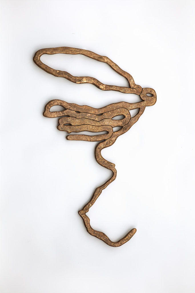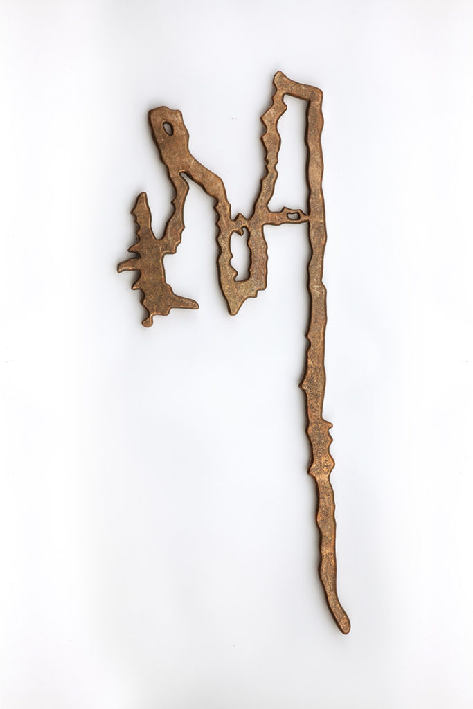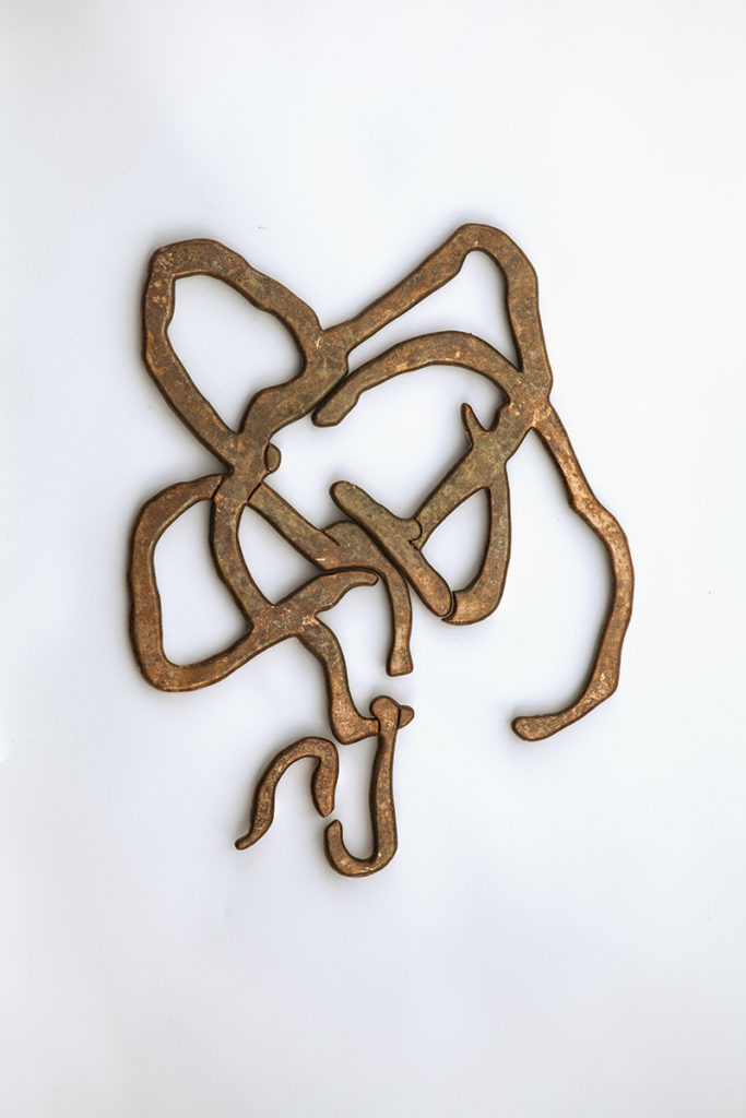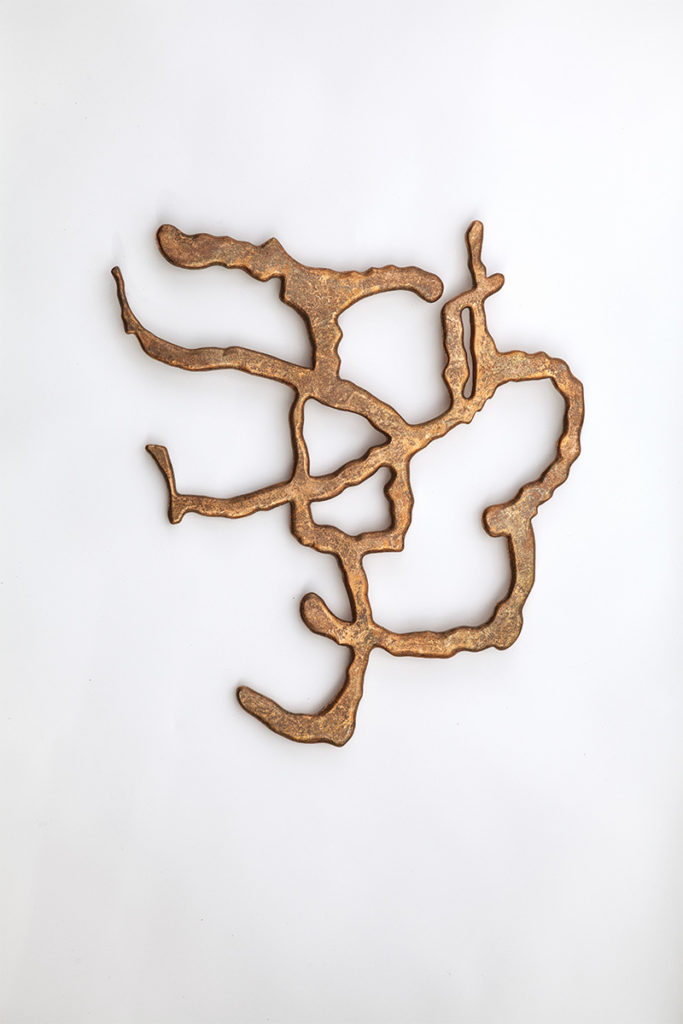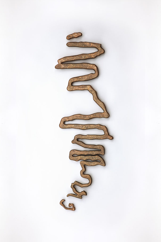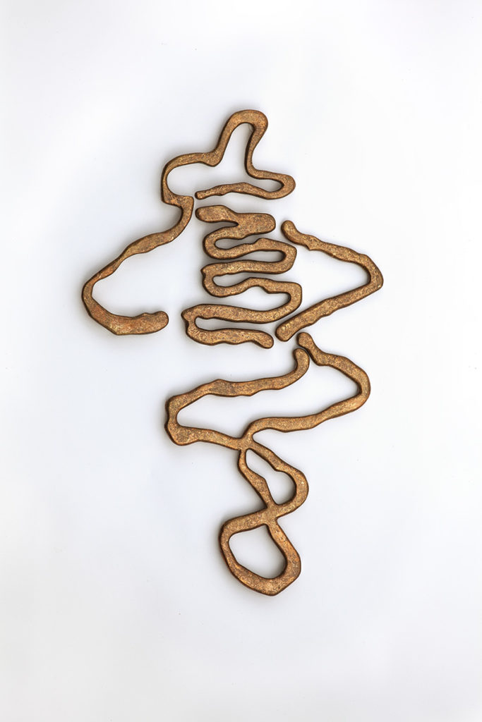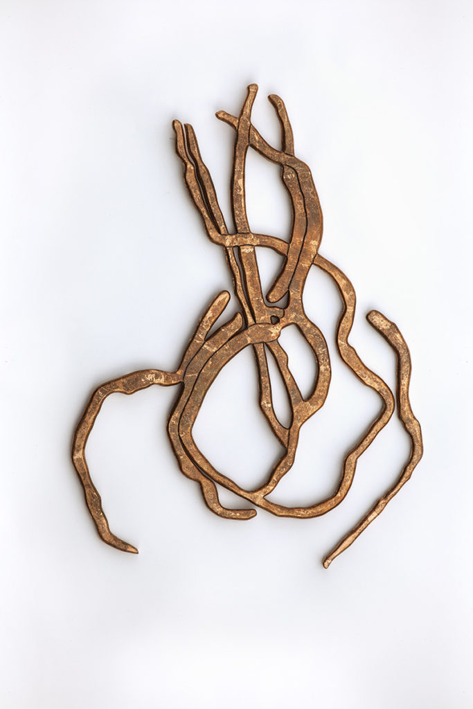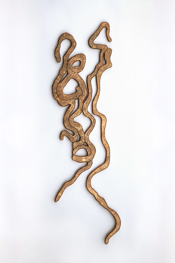 After I made a number of the Glyph document pieces based on the bark beetle outlines, I conceived the idea of the Glyphs as larger metallic objects. I imagined the kind of ceremonial artifacts which might have been carried symbolically in a procession. I enlarged the outlines of the beetle galleries onto plywood which I cut out and then covered with multiple layers of patinated copper leaf. The sculptures are flat and designed to float about an inch or two away from the wall.
